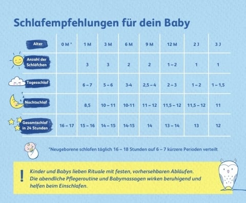 Tagsüber schlafen Neugeborene etwa 2-4 Stunden am Stück, nachts liegt der Schlafbedarf bei vier bis sechs Stunden, normalerweise eher bei 2-3. Mit der Zeit verlängert sich der nächtliche Schlaf, während die täglichen Nickerchen sich verkürzen. Meist dauert es ein halbes Jahr, bis das Baby durchschläft.