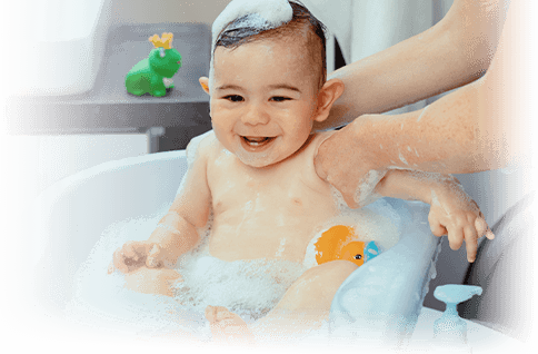 Erst, wenn die Haare dichter geworden sind, solltest du das Haarewaschen beim Baden in die regelmäßige Babypflege einbinden: mit einem milden Baby-Shampoo.